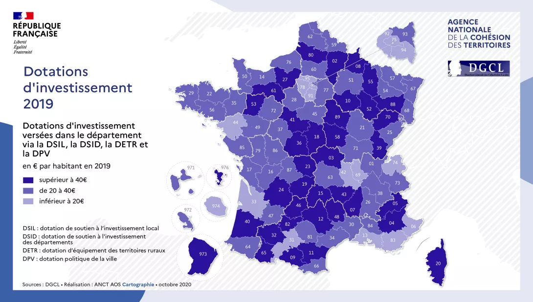 L’ANCT et la Direction générale des collectivités locales proposent une carte interactive sur les dotations d’investissement aux communes, EPCI et départements, en 2019. Au total : 1,921 milliard d’euros pour 26 718 projets dans les territoires.