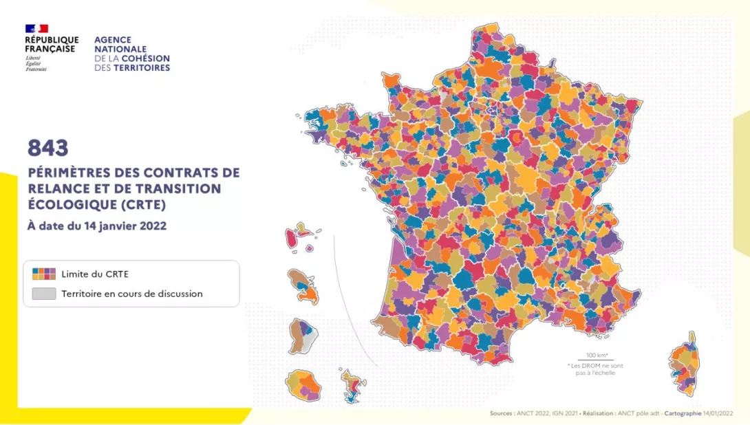 La phase de signature des contrats de relance et de transition écologique (CRTE) entre dans la dernière ligne droite. Dans sa circulaire du 4 janvier dernier, le Premier ministre souhaite la signature des derniers contrats d’ici fin janvier. Au total, 843 CRTE – élaborés dans tous les départements métropolitains et ultramarins – seront actifs dans les prochaines semaines.