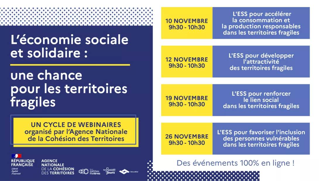 Pour le Mois de l’économie sociale et solidaire, l’ANCT organise quatre webinaires sur l’ESS dans les territoires fragiles, du 10 au 26 novembre prochain.