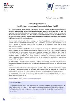 Le 3 novembre 2025, Henri Prévost a été nommé directeur général de l’Agence nationale de la cohésion des territoires (ANCT). Son expérience dans la Marine nationale, puis en tant que magistrat financier et dernièrement en tant que préfet de l’Yonne et de la Marne lui ont permis d’acquérir une connaissance fine des territoires. Ses différentes missions en administration centrale et opérateur de l’État ont par ailleurs renforcé sa culture interministérielle des politiques publiques. Il succède à Stanislas Bourron.