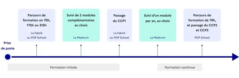 Ci-dessous un schéma représentant le parcours de formation initiale et continue disponible pour les conseillers numériques souhaitant améliorer leurs compétences et élargir leurs domaines d'actions.