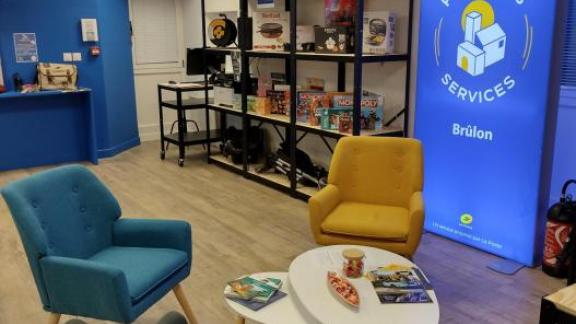 Espaces disponibles : Bureau de Poste rénové, consigne accessible en permanence, espace de coworking et ateliers.