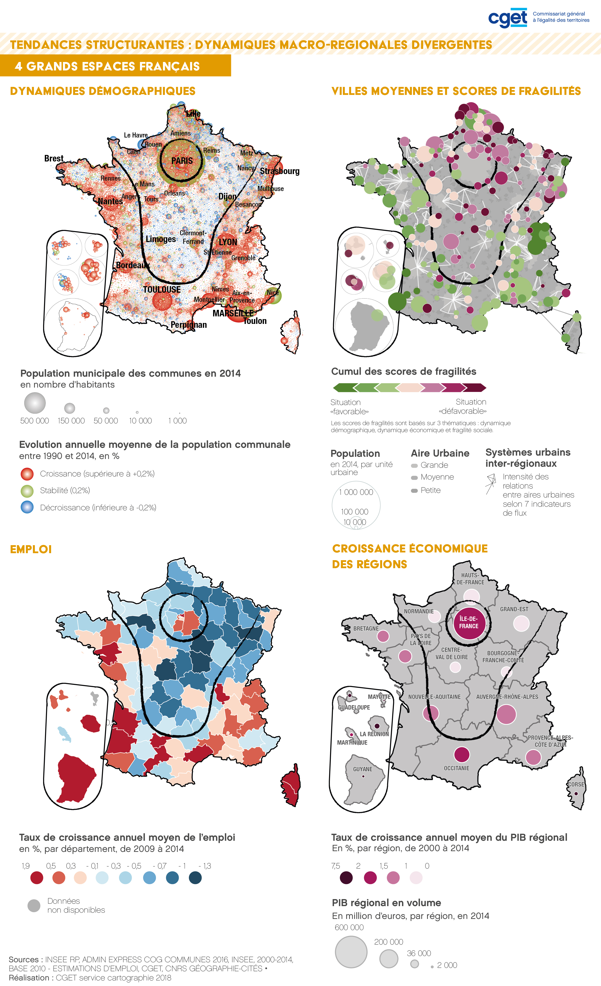 Schéma structurant de la France selon les dynamiques démographique, les scores de fragilité des villes moyennes, l'emploi et la croissance économique