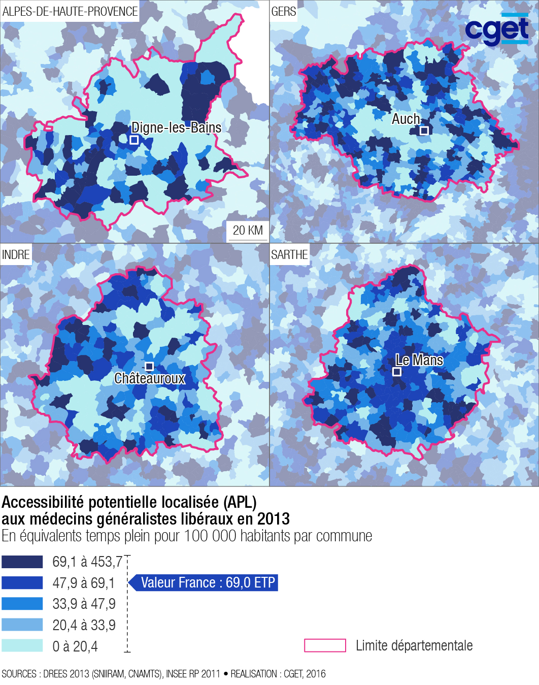 Les questions d’accessibilité aux services, et en particulier aux services de santé, sont cruciales dans les départements les plus ruraux. Les Alpes-de-Haute-Provence, le Gers, l’Indre et la Sarthe sont ici pris comme exemples de situations vis-à-vis de l’accès aux médecins généralistes, via l’indicateur d’accessibilité potentielle localisée (APL, voire p. 142 pour la définition), dans de tels départements à caractéristiques rurales marquées. Ces 4 départements ont des densités de population inférieures à la moyenne nationale (respectivement 23 habitants/km2, 30 habitants/km2, 33 habitants/km2 et 92 habitants/km2).
