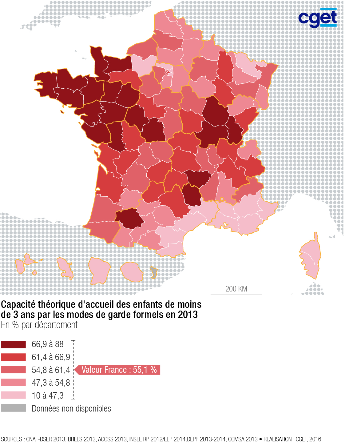 Selon le département, cette capacité d’accueil varie considérablement, de 10 (Guyane) à 88 places (Haute-Loire) pour 100 enfants de moins de 3 ans. Sur le territoire métropolitain, l’ensemble des départements de Bretagne et des Pays de la Loire affichent des capacités d’accueil théorique supérieures à 70 places pour 100 enfants. Le pourtour méditerranéen apparaît au contraire en net retard en termes d’équipement, avec des taux inférieurs à 45 places pour 100 enfants dans la plupart de ces départements.