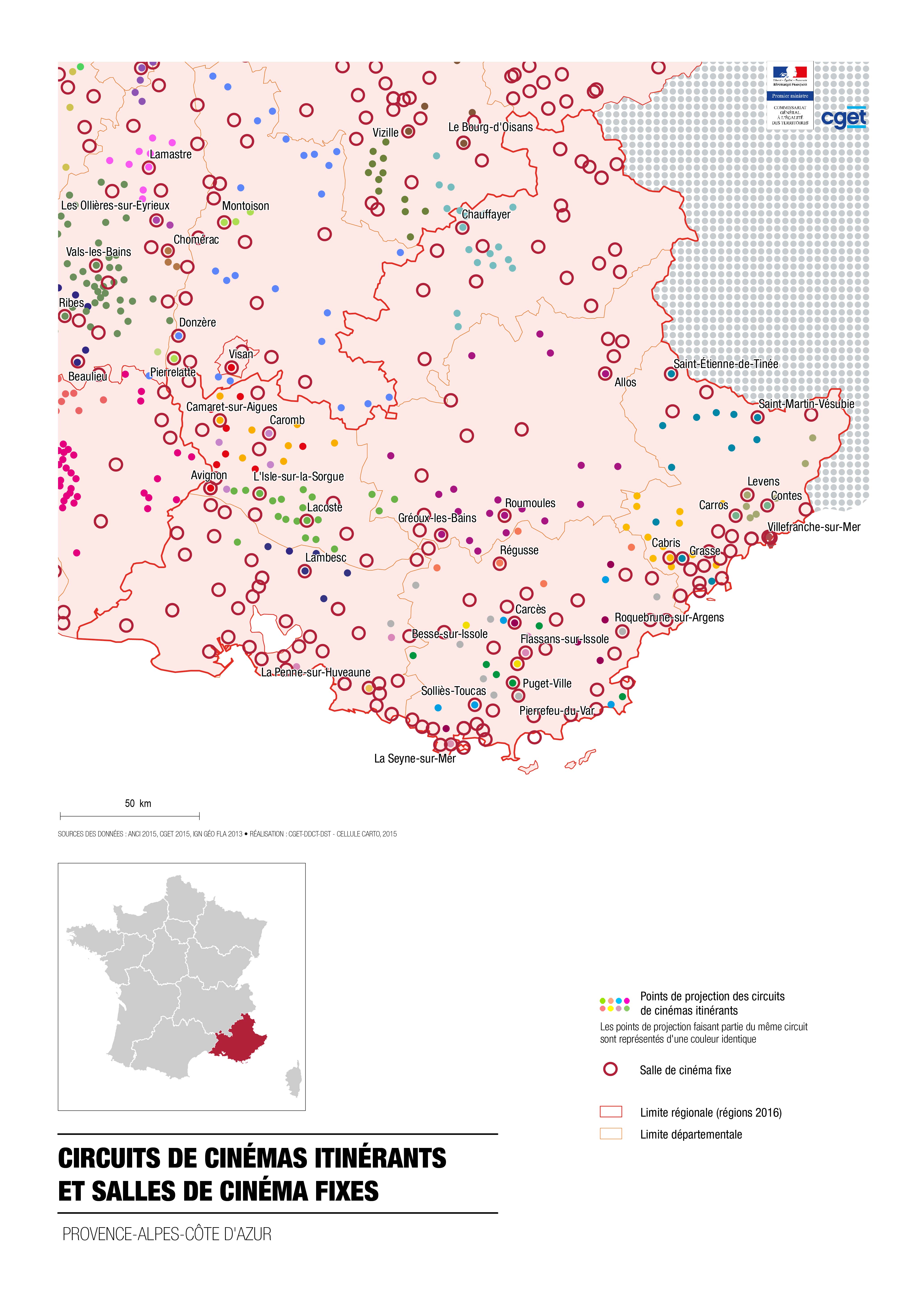 Cette carte fait partie de la collection "Circuits des cinémas itinérants" réalisée par le CGET, l'ANCI (l'Association Nationale des Cinémas Itinérants) et le CNC (Centre national du cinéma et de l'image animée).