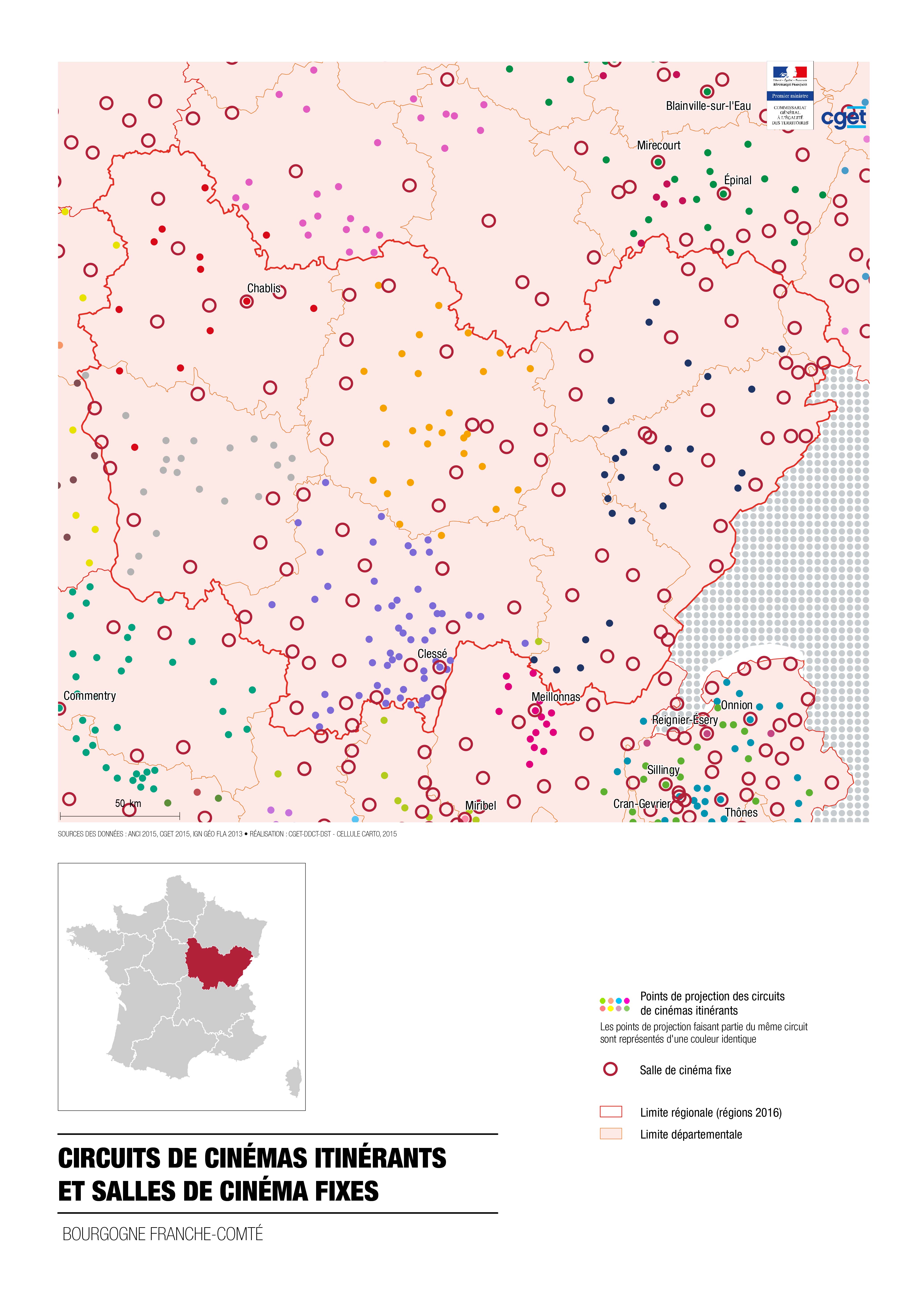 Cette carte fait partie de la collection "Circuits des cinémas itinérants" réalisée par le CGET, l'ANCI (l'Association Nationale des Cinémas Itinérants) et le CNC (Centre national du cinéma et de l'image animée).
