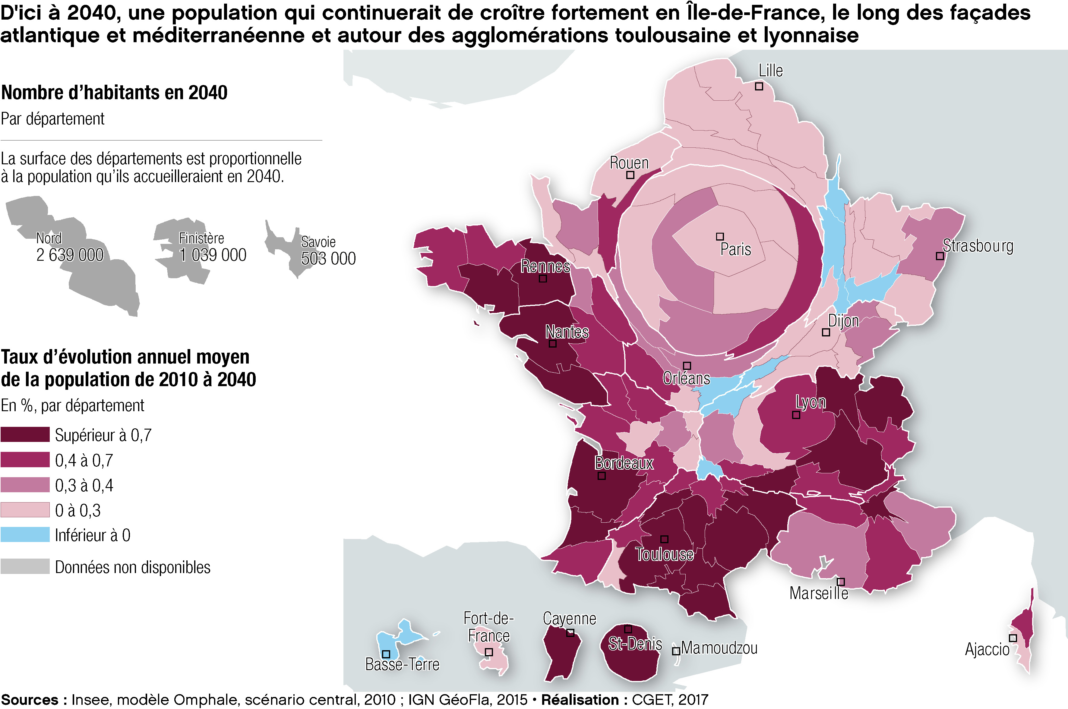 Source: D'ici à 2040, une population qui continuerait de croître fortement en Île-de-France, le long des façades atlantique et méditerranéenne et autour des agglomérations toulousaine et lyonnaise