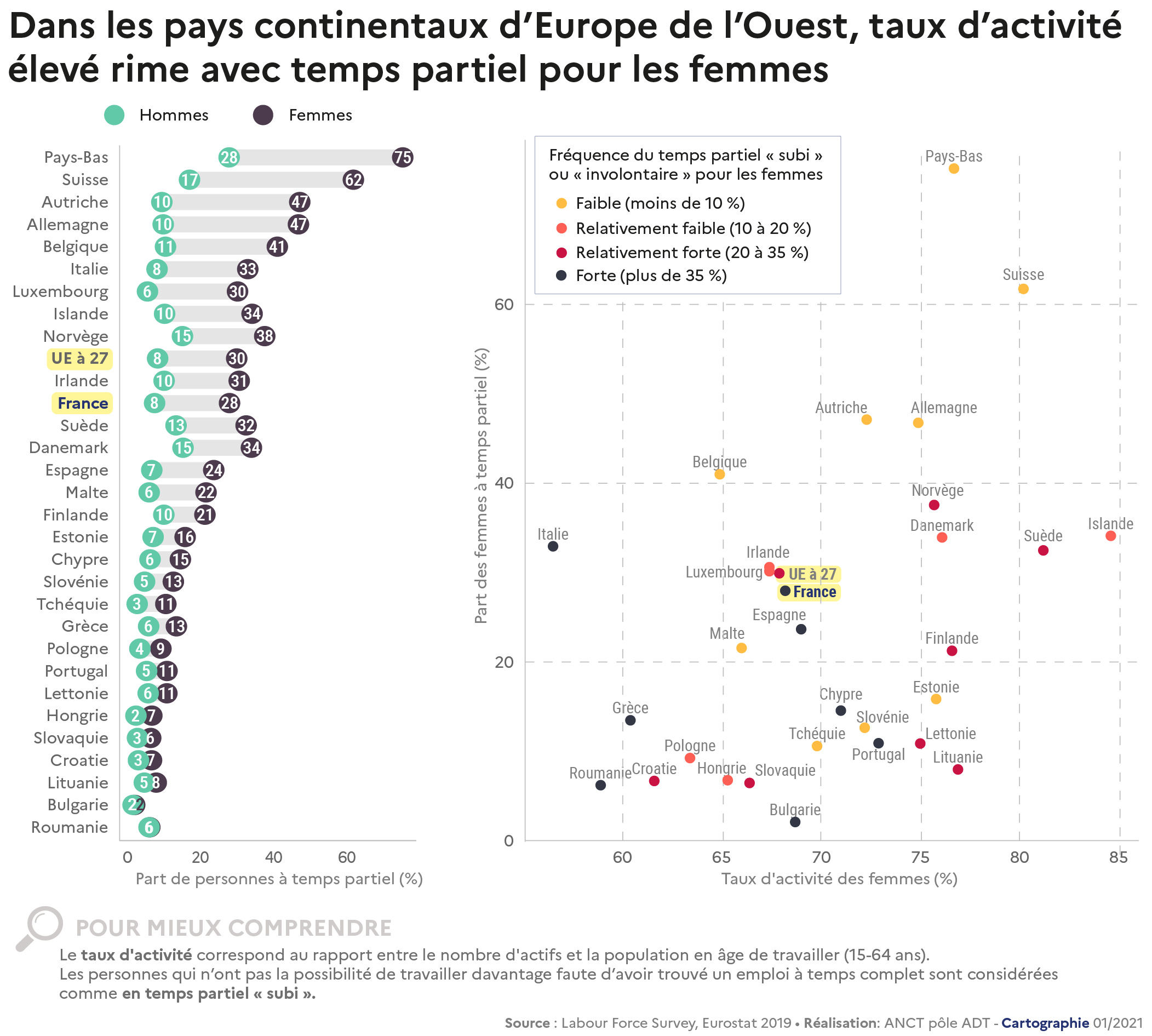 Ecart de la part de personnes à temps partiel entre les femmes et les hommes et fréquence du temps partiel "subi" ou "involontaire" pour les femmes, en 2019
