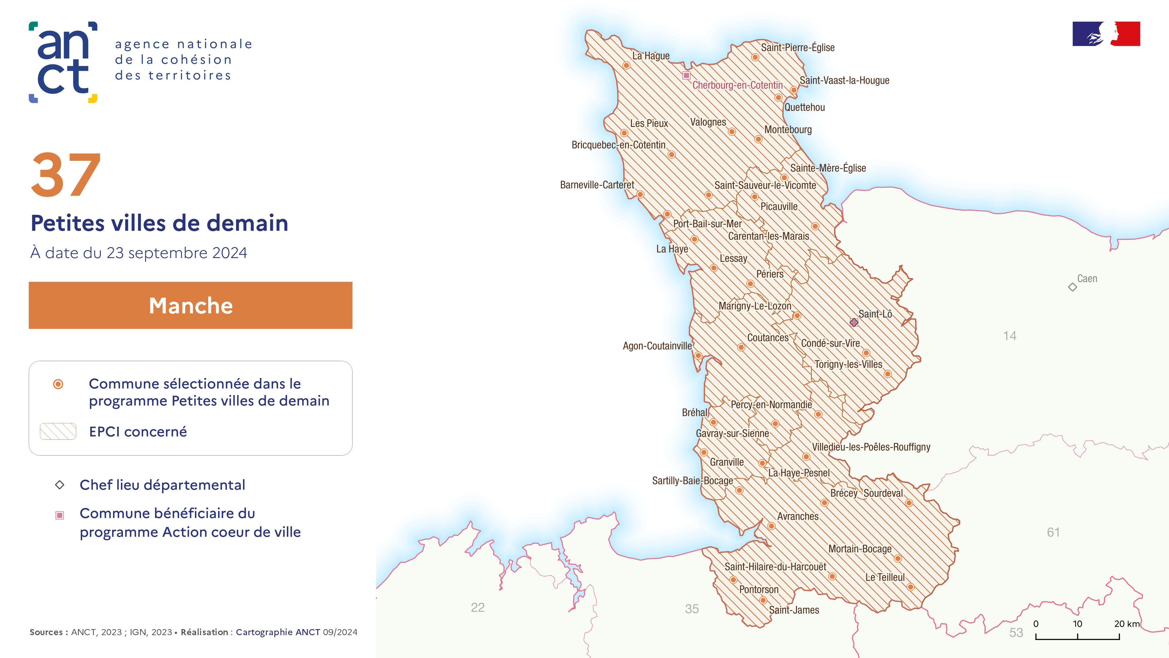 Communes retenues dans le dispositif Petites villes de demain. Petites villes de demain vise à améliorer les conditions de vie des habitants des petites communes et des territoires alentour, en accompagnant les collectivités dans des trajectoires dynamiques et respectueuses de l'environnement. Le programme a pour objectif de donner aux élus des villes et leurs intercommunalités de moins de 20 000 habitants exerçant des fonctions de centralités les moyens de concrétiser leurs projets de territoires.