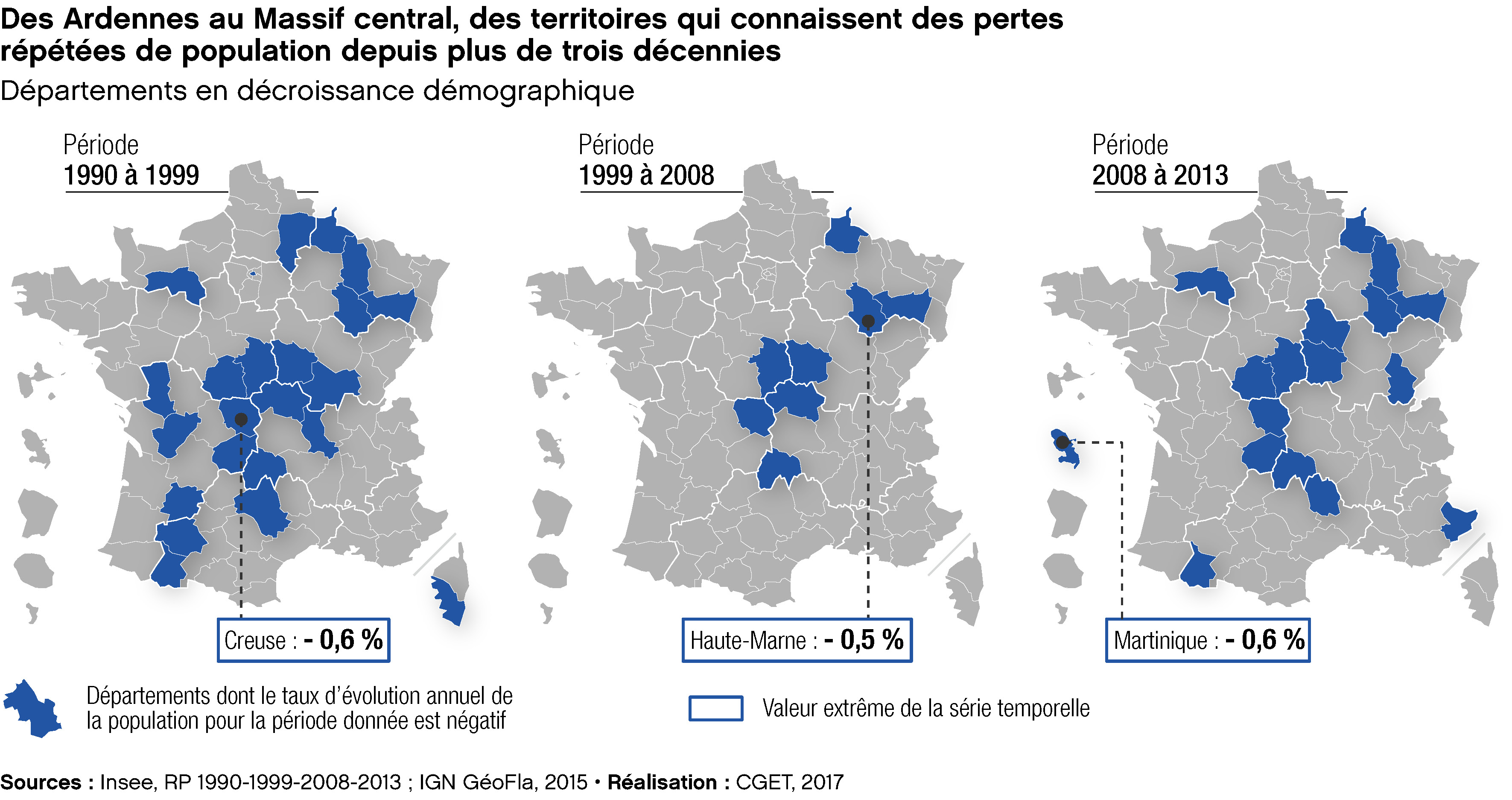Des Ardennes au Massif central, des territoires qui connaissent des pertes répétées de population depuis plus de trois décennies