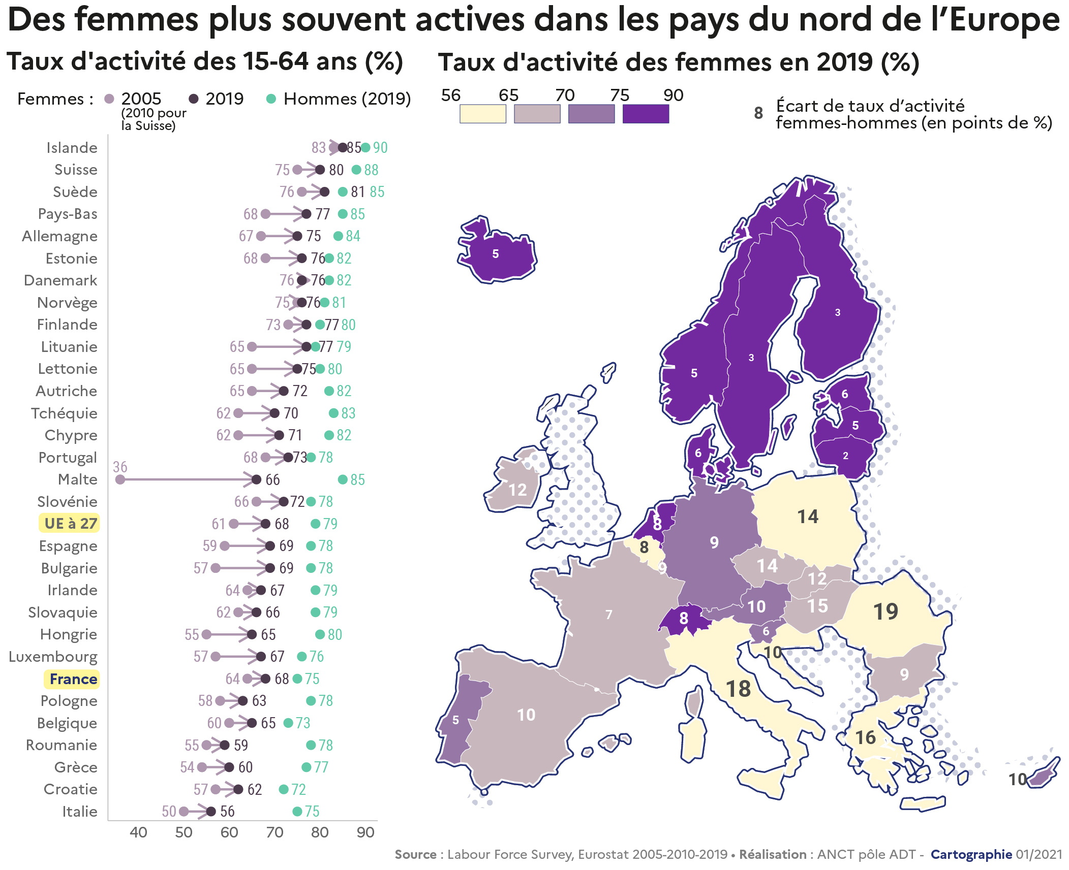 Source: Des femmes plus souvent actives dans les pays du nord de l'Europe