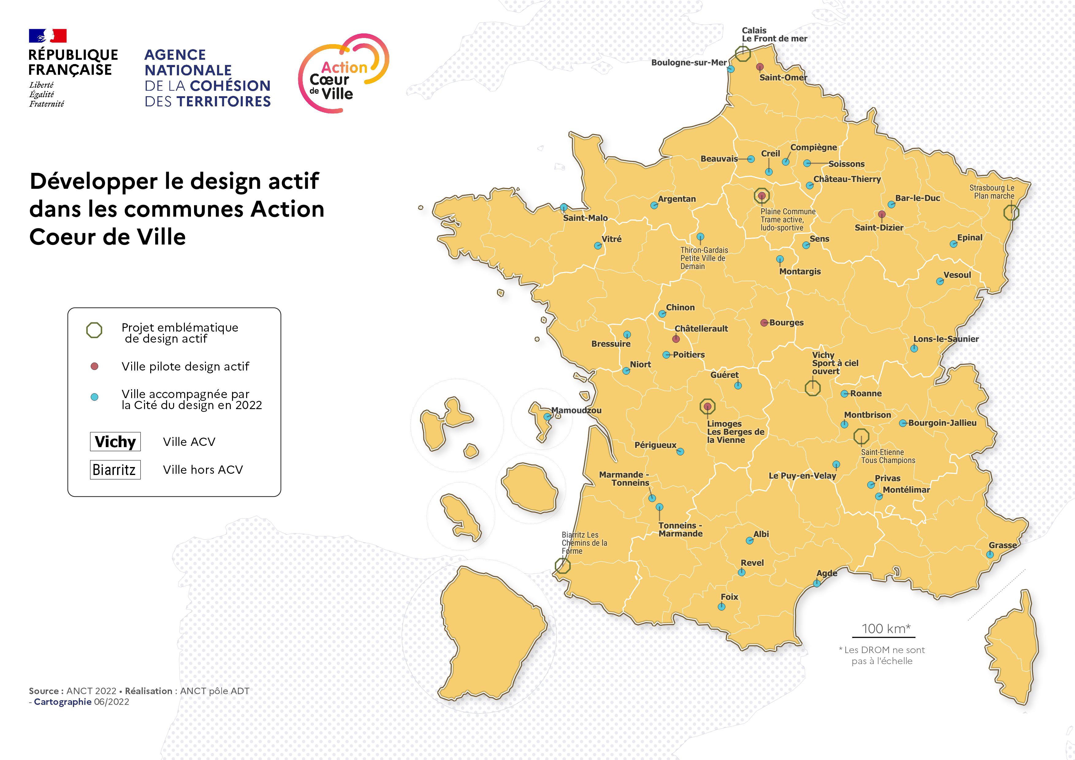 Projets emblématiques de design actif - Villes pilotes design actif - Villes accompagnées par la Cité du design en 2022 pour les villes ACV et hors ACV