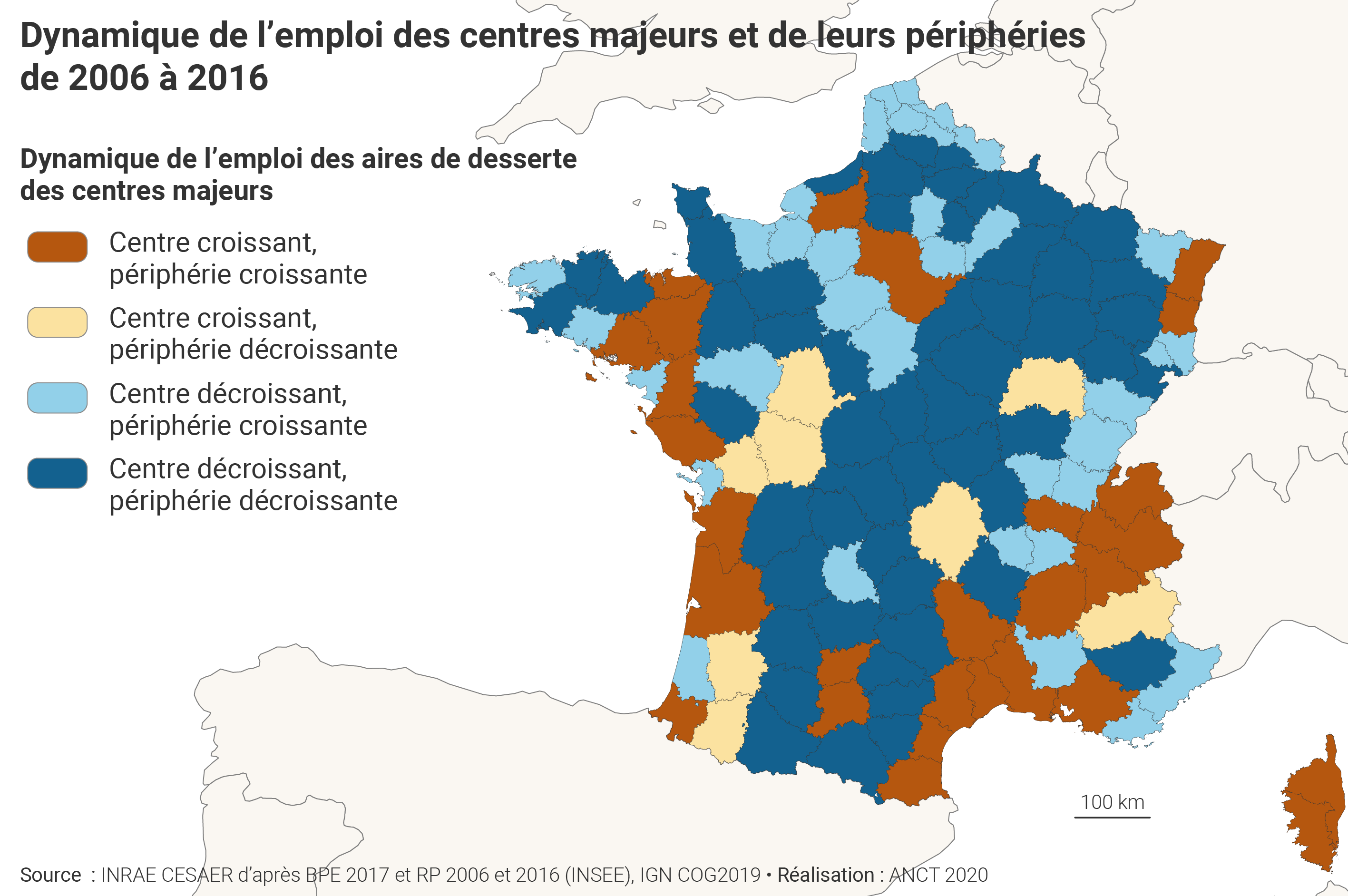 Dynamique de l'emploi des centres majeurs et de leurs périphéries de 2006 à 2016