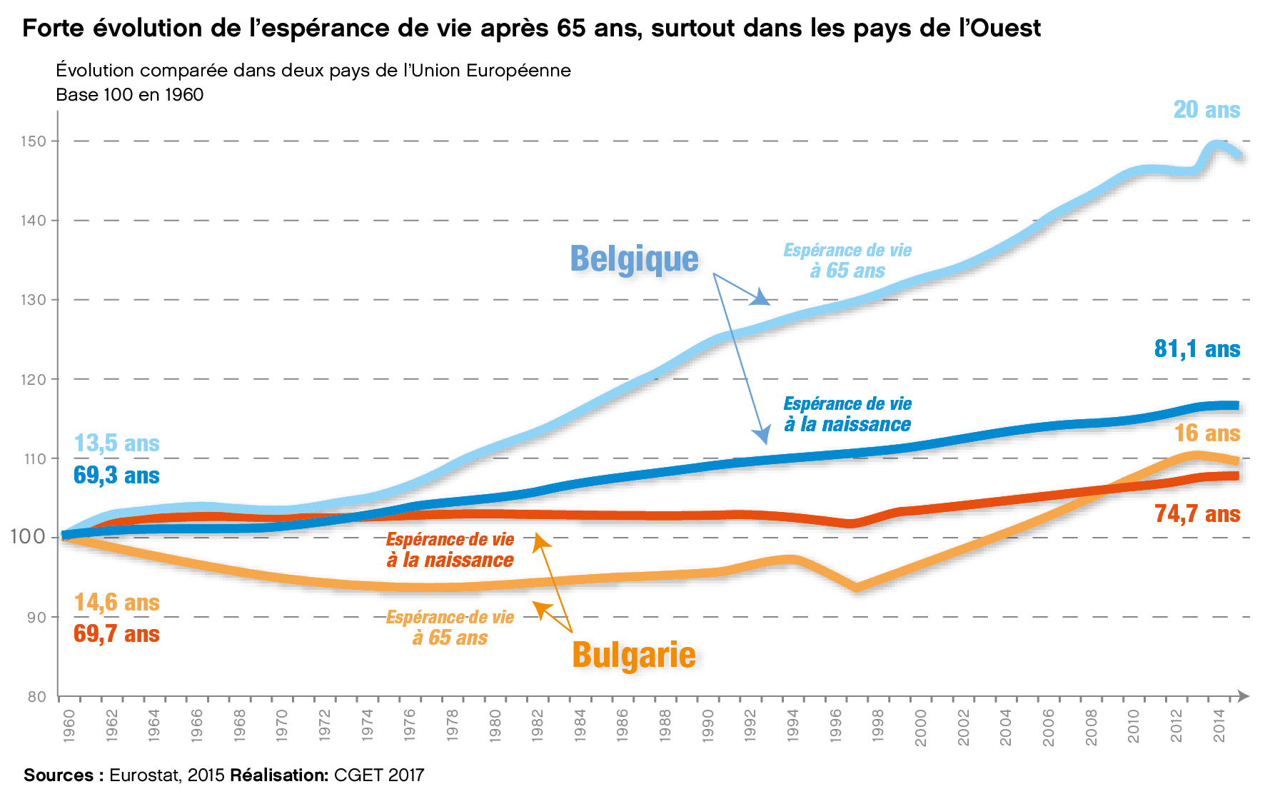 Forte évolution de l'espérance de vie après 65 ans, surtout dans les pays de l'Ouest