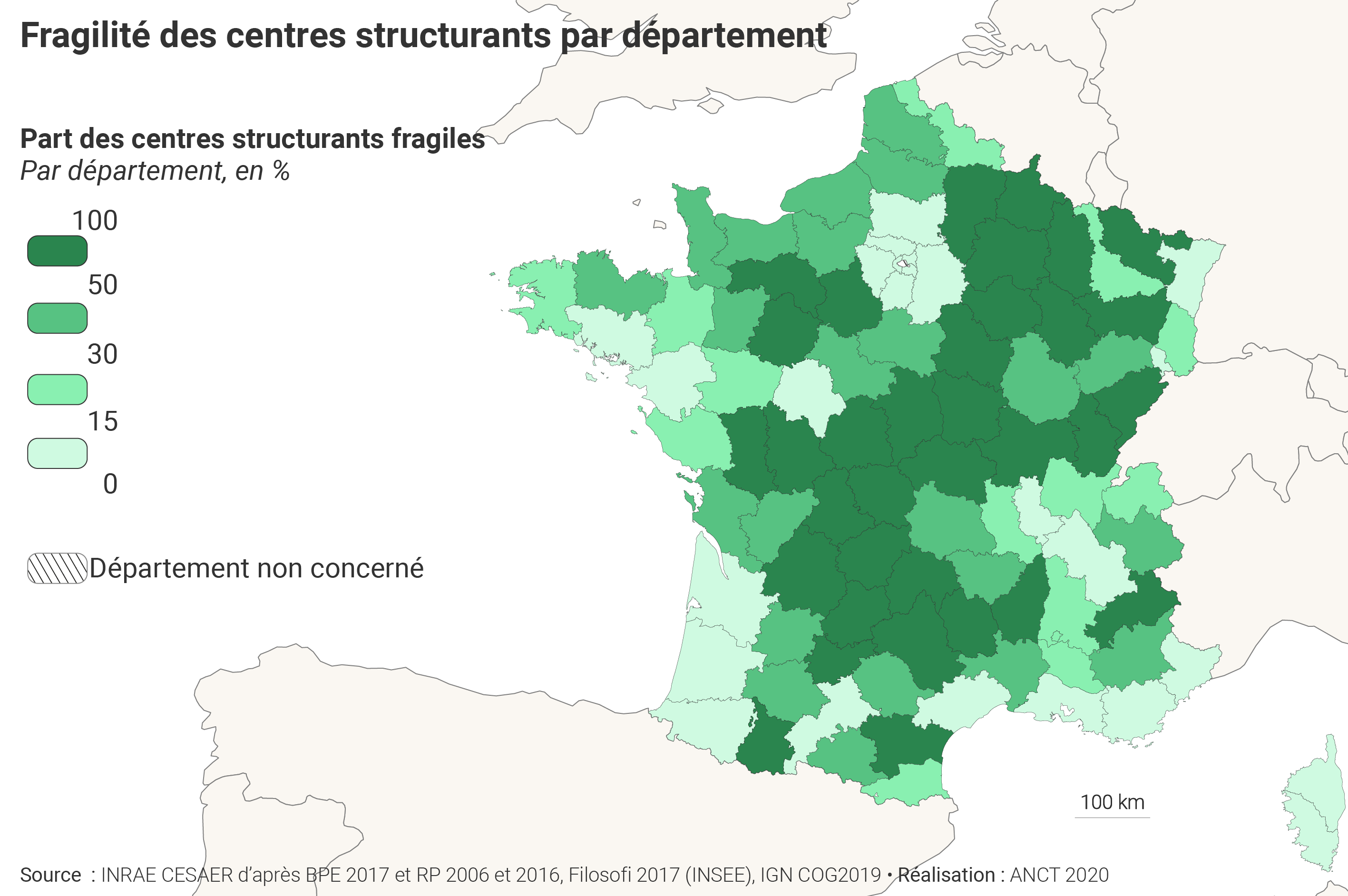 Part des centres structurants fragiles par département (%)