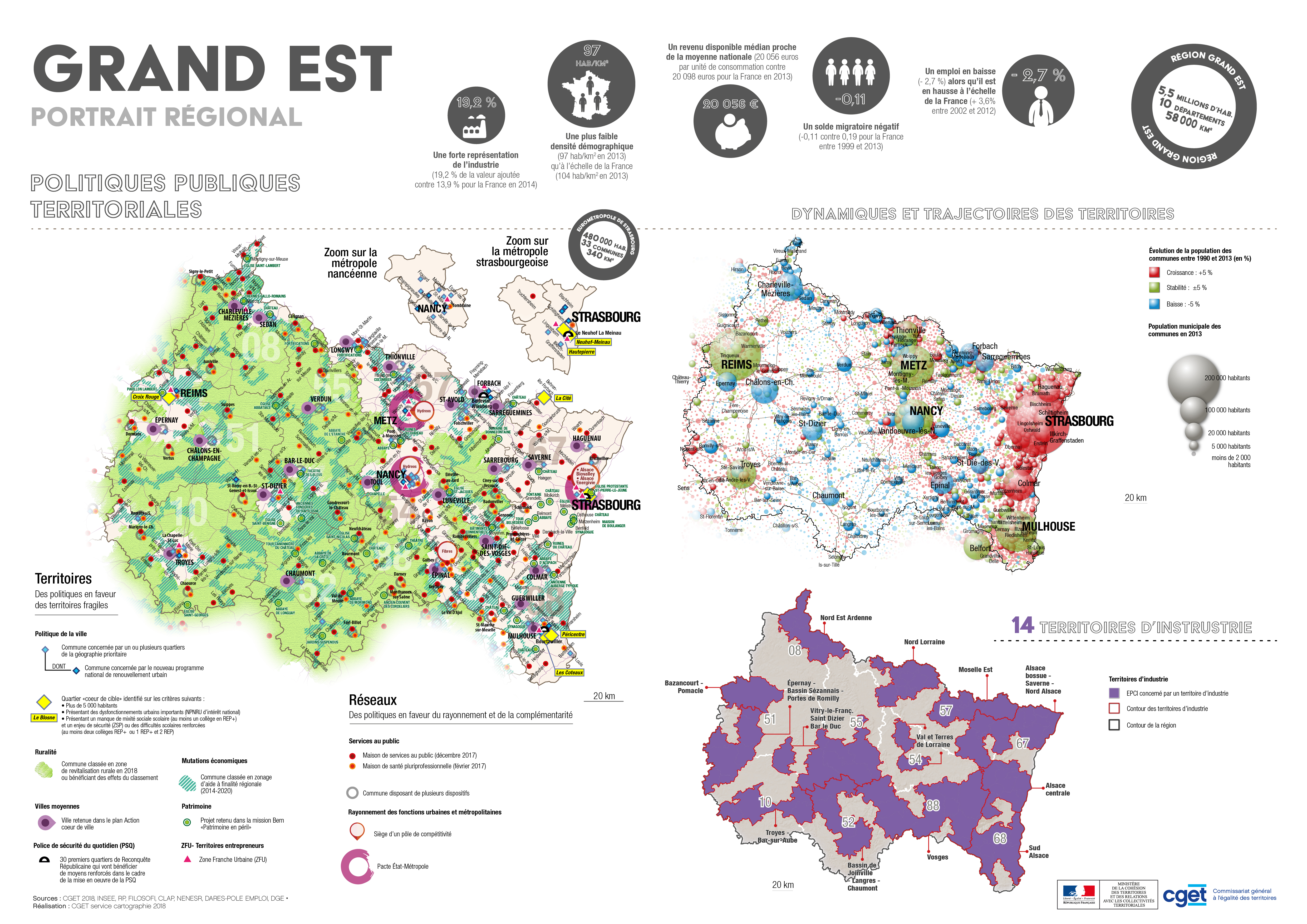 La série des portraits régionaux présente les dynamiques démographiques du territoire, quelques chiffres clefs, et une série de dispositifs publics portés notamment par le CGET : Territoires d'Industrie, Politique de la Ville, Action Coeur de Ville, Maisons de Services au Public, Zones de Revitalisation Rurale...