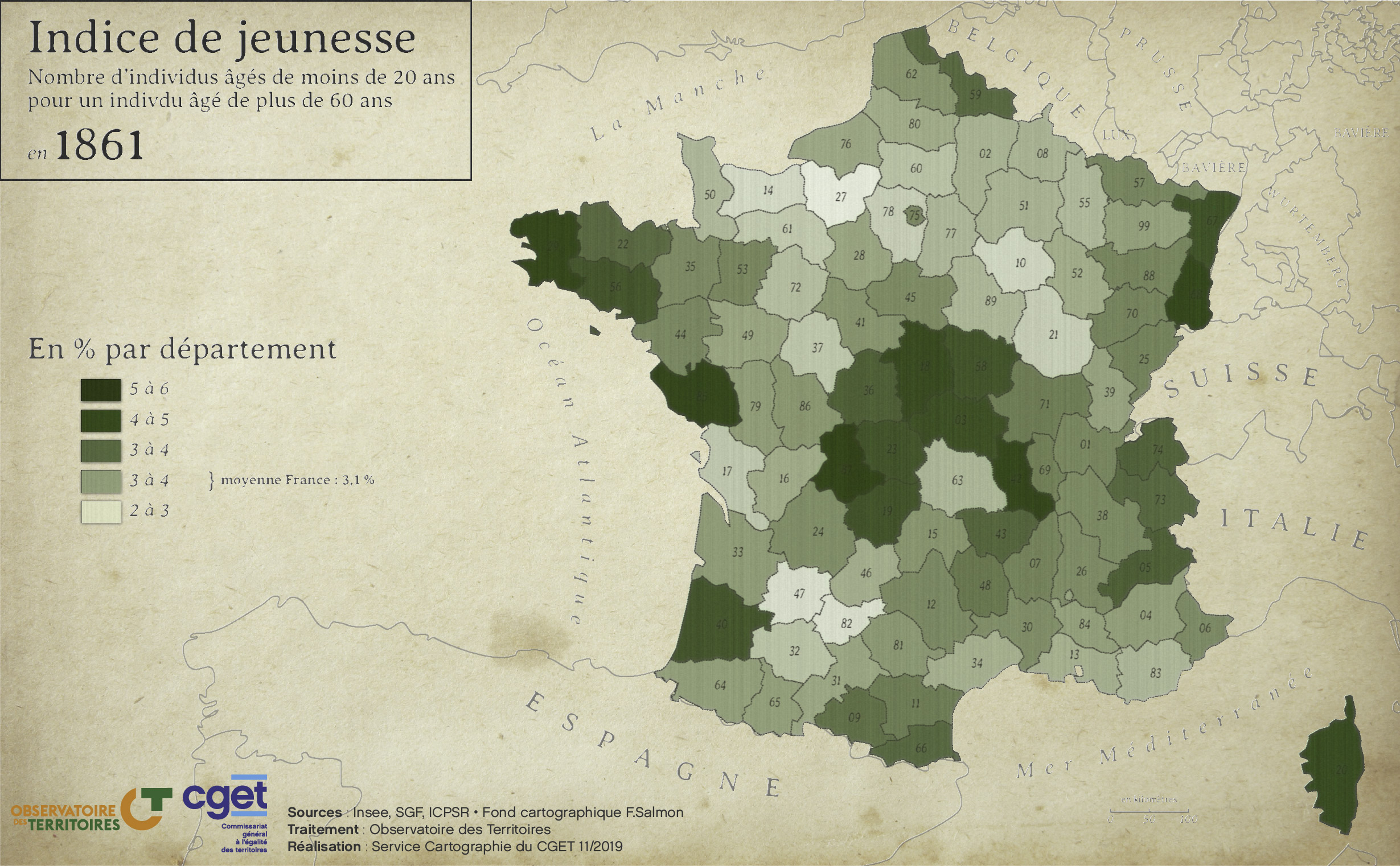 Nombre d'individus âgés de moins de 20 ans pour un dividu âgé de plus de 60 ans, en 1861 ; carte faisant la promotion de la librairie R "SGF" développée par l'Observatoire des Territoires : https://github.com/observatoire-territoires/sgf