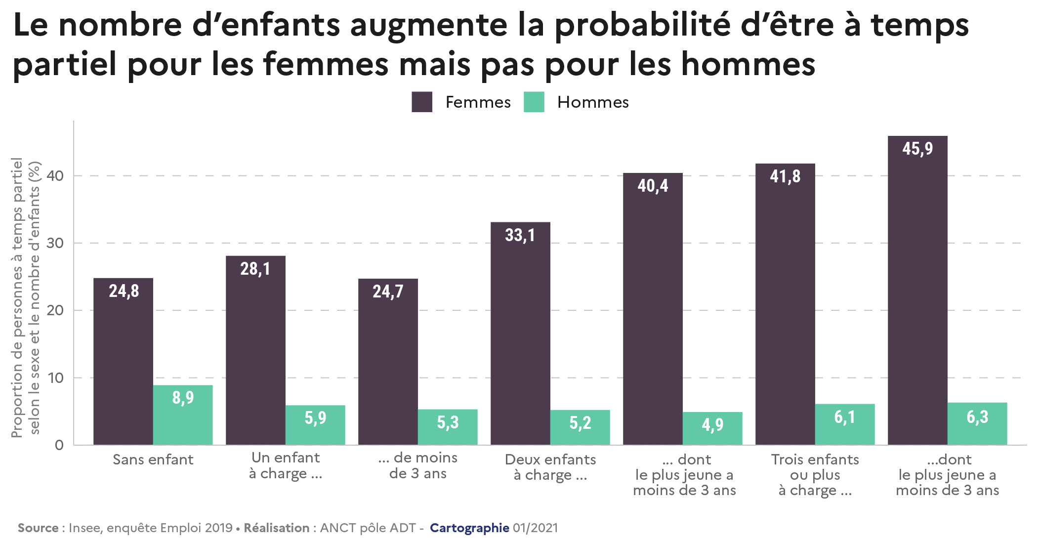 Échelle: Le nombre d'enfants augmente la probabilité d'être à temps partiel pour les femmes mais pas pour les hommes