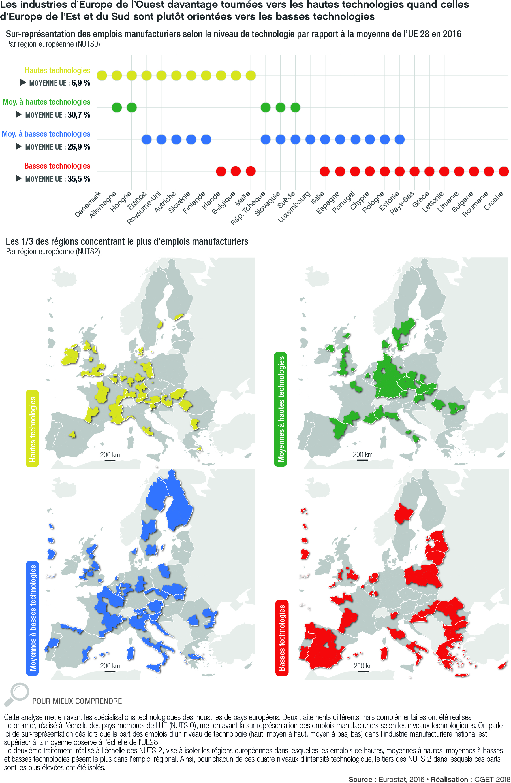 Sur-représentation des emplois manufacturiers selon le niveau de technologie par rapport à la moyenne de l'UE 28 en 2016 ; Les 1/3 des régions concentrant le plus d'emplois manufacturiers