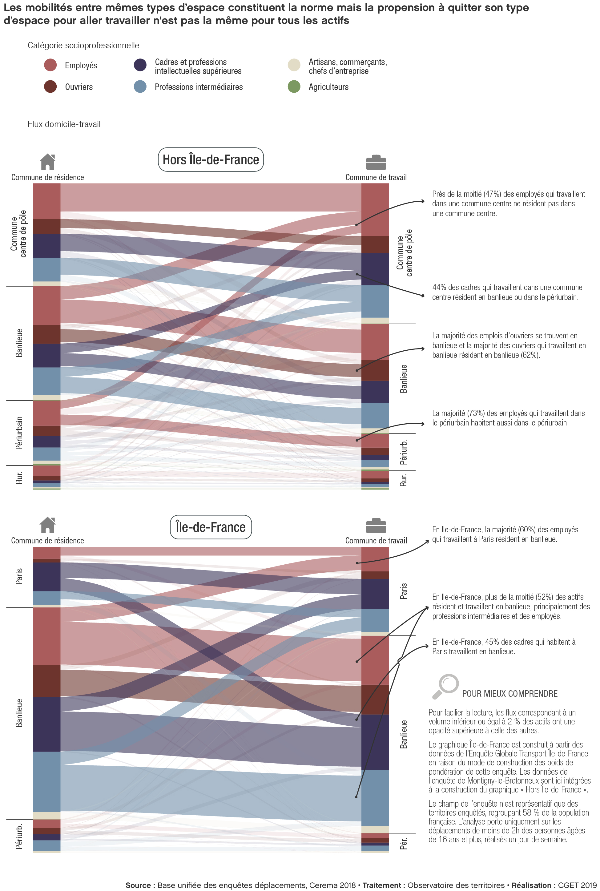 Flux domicile-travail selon le type d'espace et selon la catégorie socioprofessionnelle.