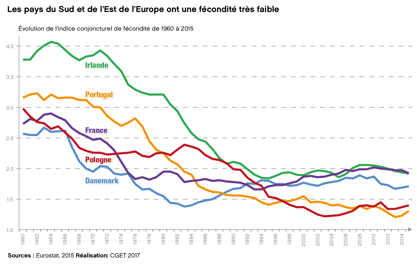 Évolution de l'indice conjoncturel de fécondité de 1960 à 2015