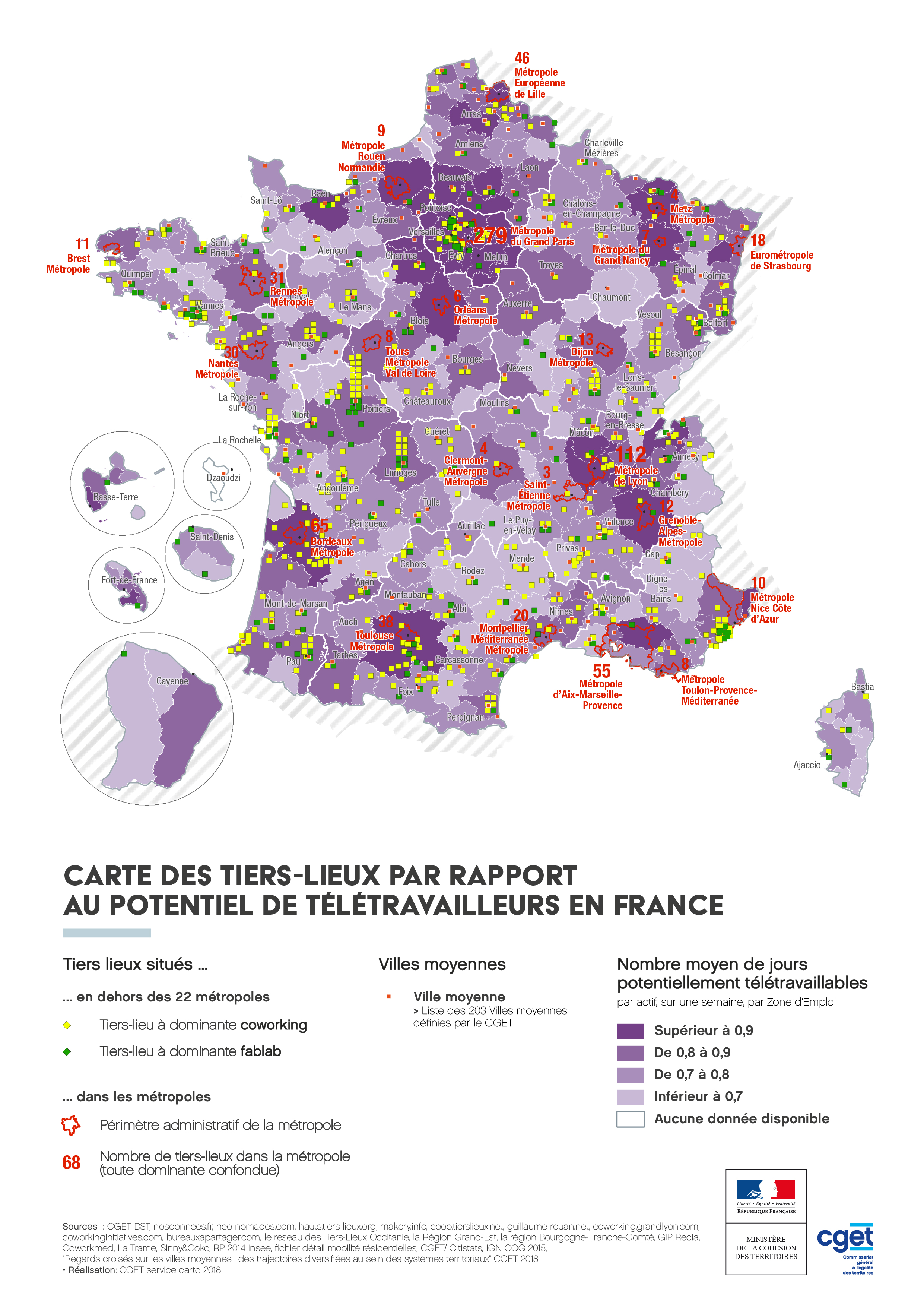 Patrick Lévy-Waitz, président de la fondation Travailler Autrement, a remis à Julien Denormandie, secrétaire d’État à la Cohésion des territoires, le rapport de la Mission coworking – Territoires, travail, numérique, au makerspace ICI Montreuil (93), le 19 septembre 2018. Dans le cadre de ce rapport, l'Observatoire des Territoires et le service cartographie du CGET ont réalisé un dossier cartographique de 40 cartes sur la problématique des Tiers-lieux en France.