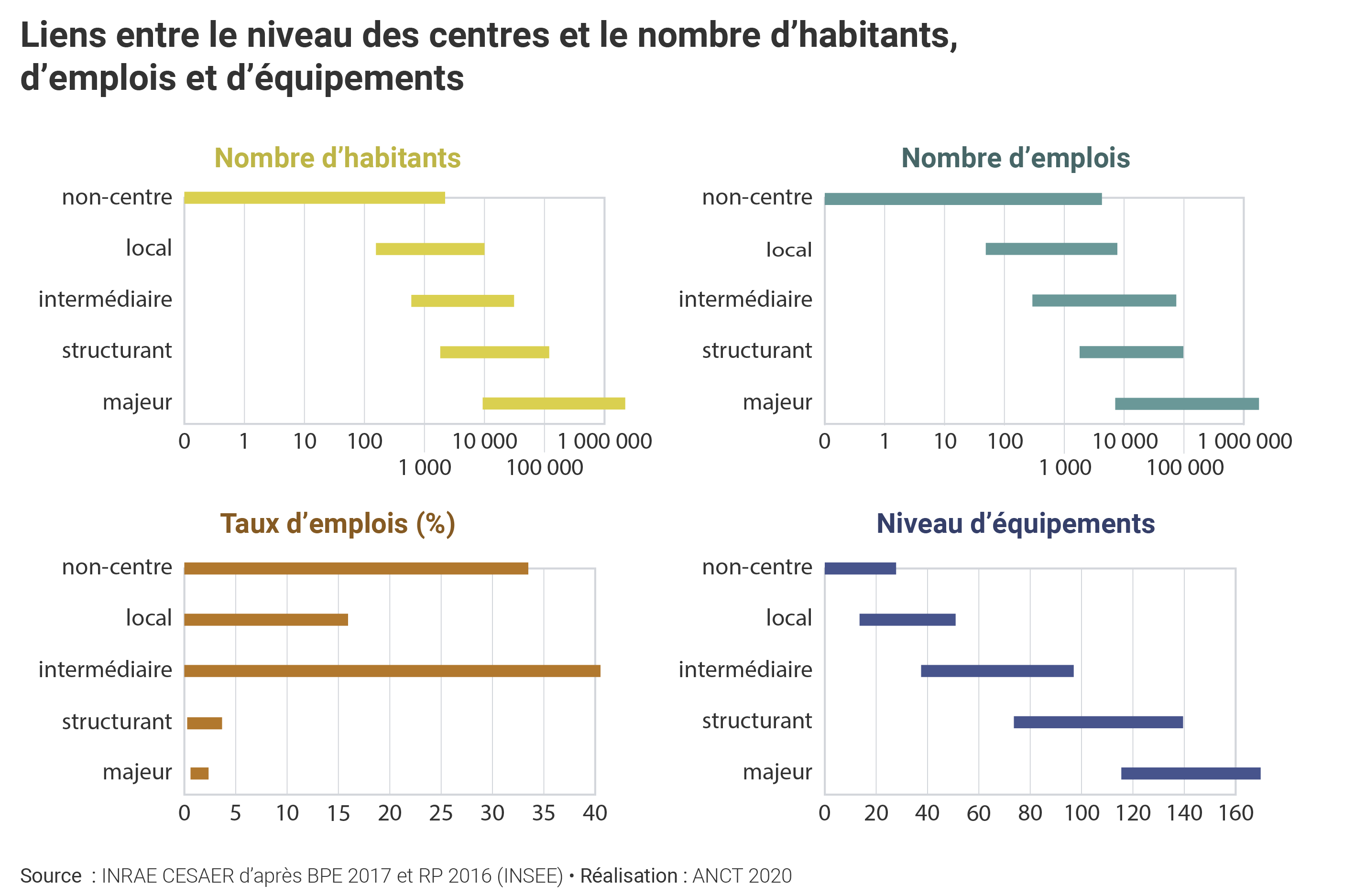 Échelle: Liens entre le niveau des centres et le nombre d'habitants, d'emplois et d'équipements