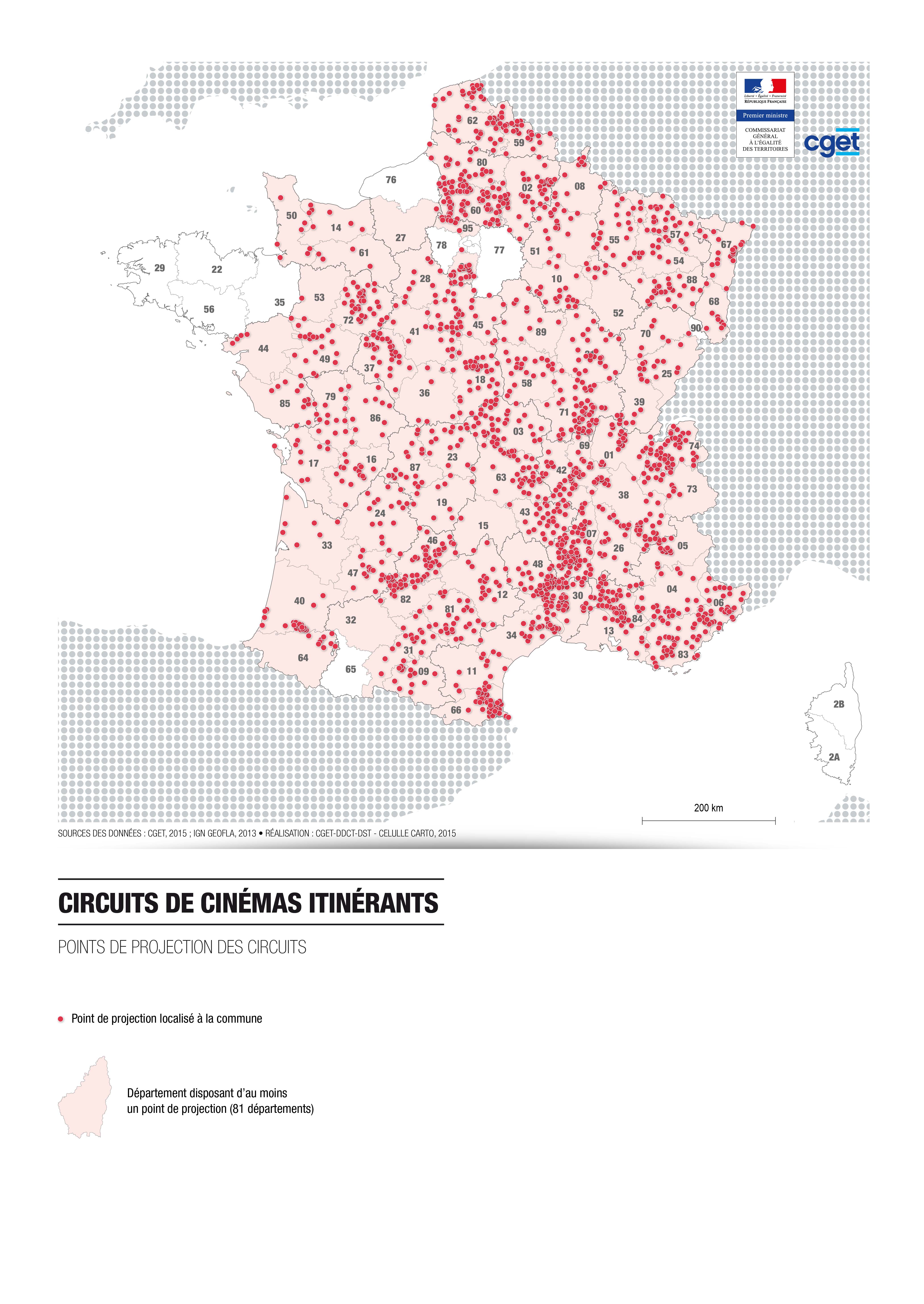 Cette carte fait partie de la collection "Circuits des cinémas itinérants" réalisée par le CGET, l'ANCI (l'Association Nationale des Cinémas Itinérants) et le CNC (Centre national du cinéma et de l'image animée).