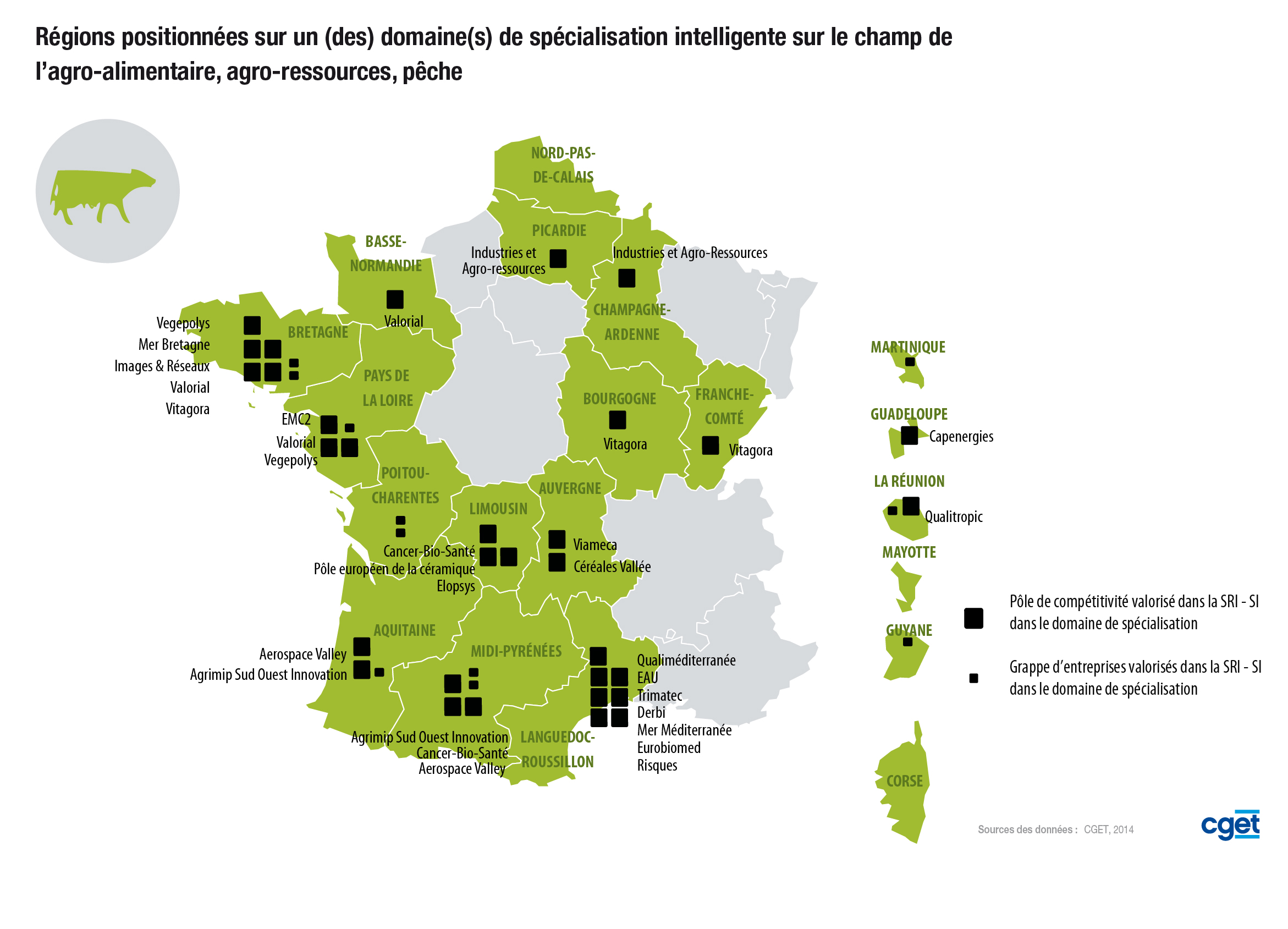 > Sont présentés sur cette carte les pôles de compétitivité valorisé dans la SRI/SI dans ce domaine de spécialisation ainsi que les grappes d'entreprises valorisés dans la SRI/SI du domaine de spécialisation.