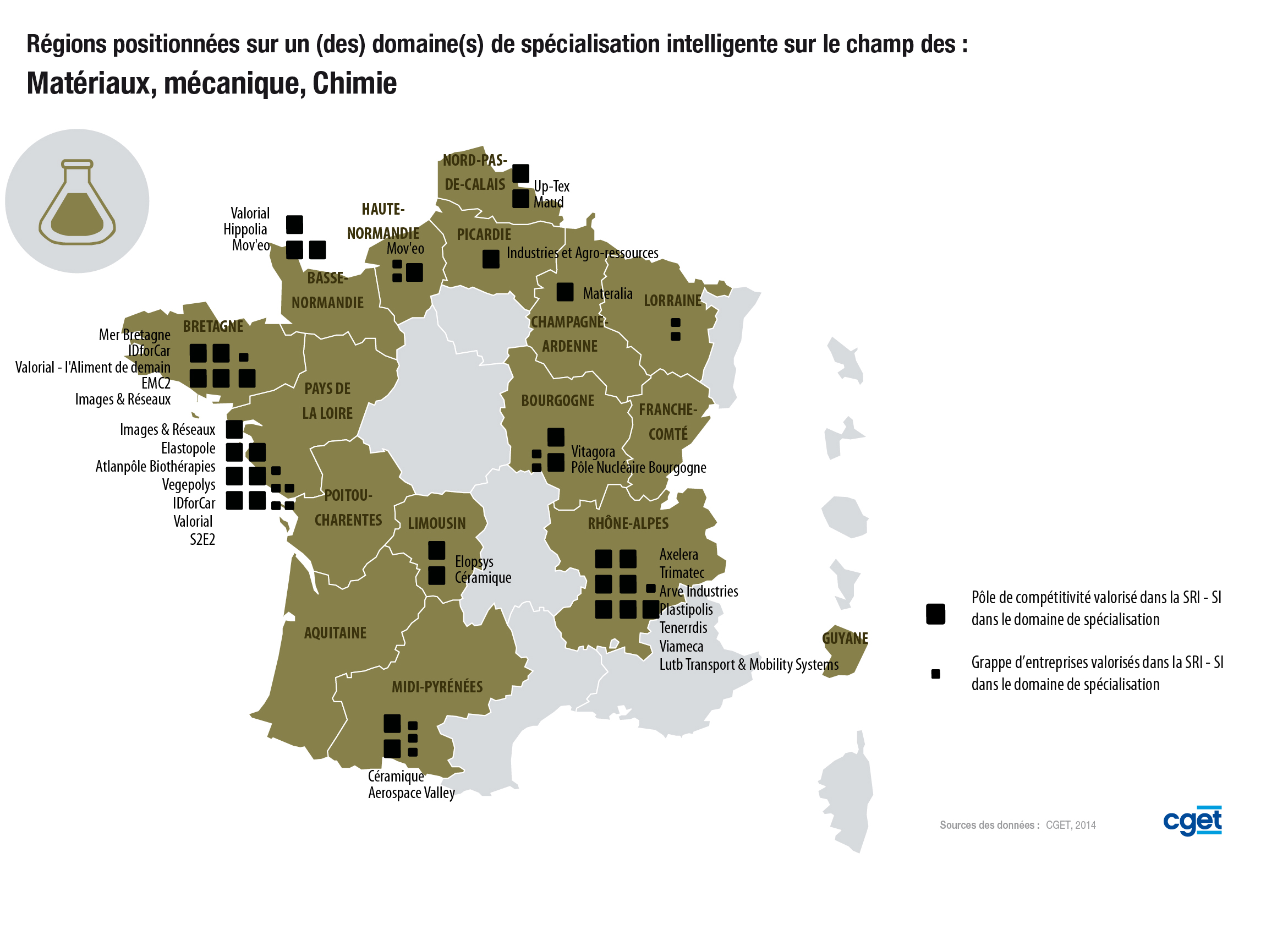 > Sont présentés sur cette carte les pôles de compétitivité valorisé dans la SRI/SI dans ce domaine de spécialisation ainsi que les grappes d'entreprises valorisés dans la SRI/SI du domaine de spécialisation.