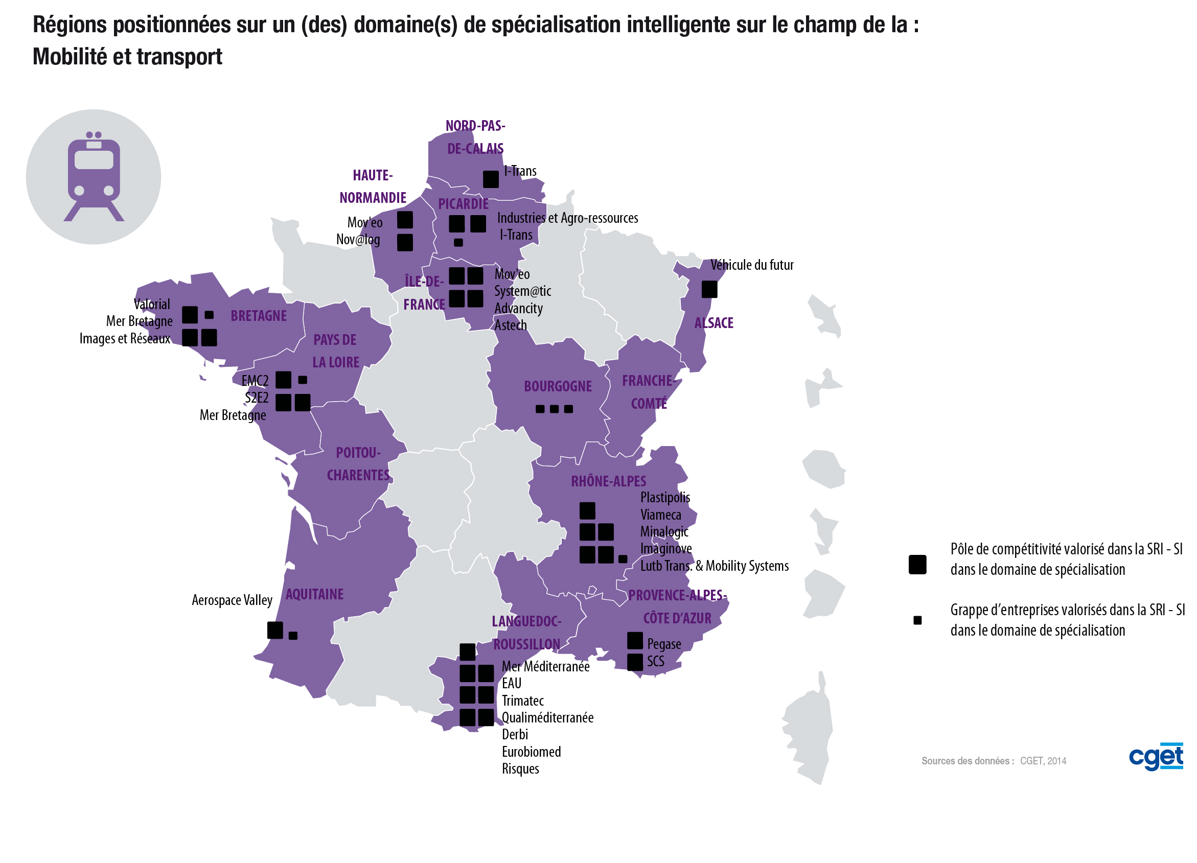 > Sont présentés sur cette carte les pôles de compétitivité valorisé dans la SRI/SI dans ce domaine de spécialisation ainsi que les grappes d'entreprises valorisés dans la SRI/SI du domaine de spécialisation.