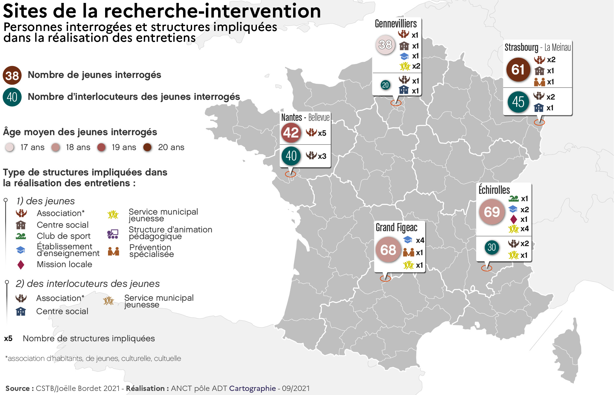 Sites de la recherche-intervention : personnes interrogées et structures impliquées dans la réalisation des entretiens sur l'esprit critique des jeunes