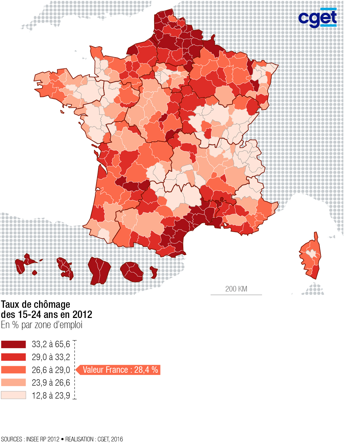 En 2012, le taux de chômage des 15-24 ans (part des chômeurs dans la population active, les actifs incluant, dans le recensement, les étudiants exerçant une activité professionnelle) est de 28,4 % en France. Il est supérieur à la moyenne nationale, tout âge confondu, qui est de 10,6 %. Selon la zone d’emploi, le taux de chômage des 15-24 ans peut très fortement varier : de 12,8 % (Maurienne) à 65,6 % (Saint-Laurent-du-Maroni, en Guyane). Les DOM sont les territoires les plus durement touchés puisque 16 zones d’emploi sur 17 ont un taux de chômage des 15-24 ans supérieur à 50 %. Viennent ensuite les territoires situés à l’extrême nord et à l’extrême sud de l’hexagone. Les jeunes chômeurs des anciennes régions Champagne-Ardenne et Lorraine sont eux aussi surreprésentés par rapport au seuil national. Tous ces territoires sont des zones dans lesquelles la part des jeunes non-diplômés est plus importante, voire beaucoup plus importante, que la moyenne nationale. Or, le chômage touche davantage les non ou peu diplômés que les diplômés.