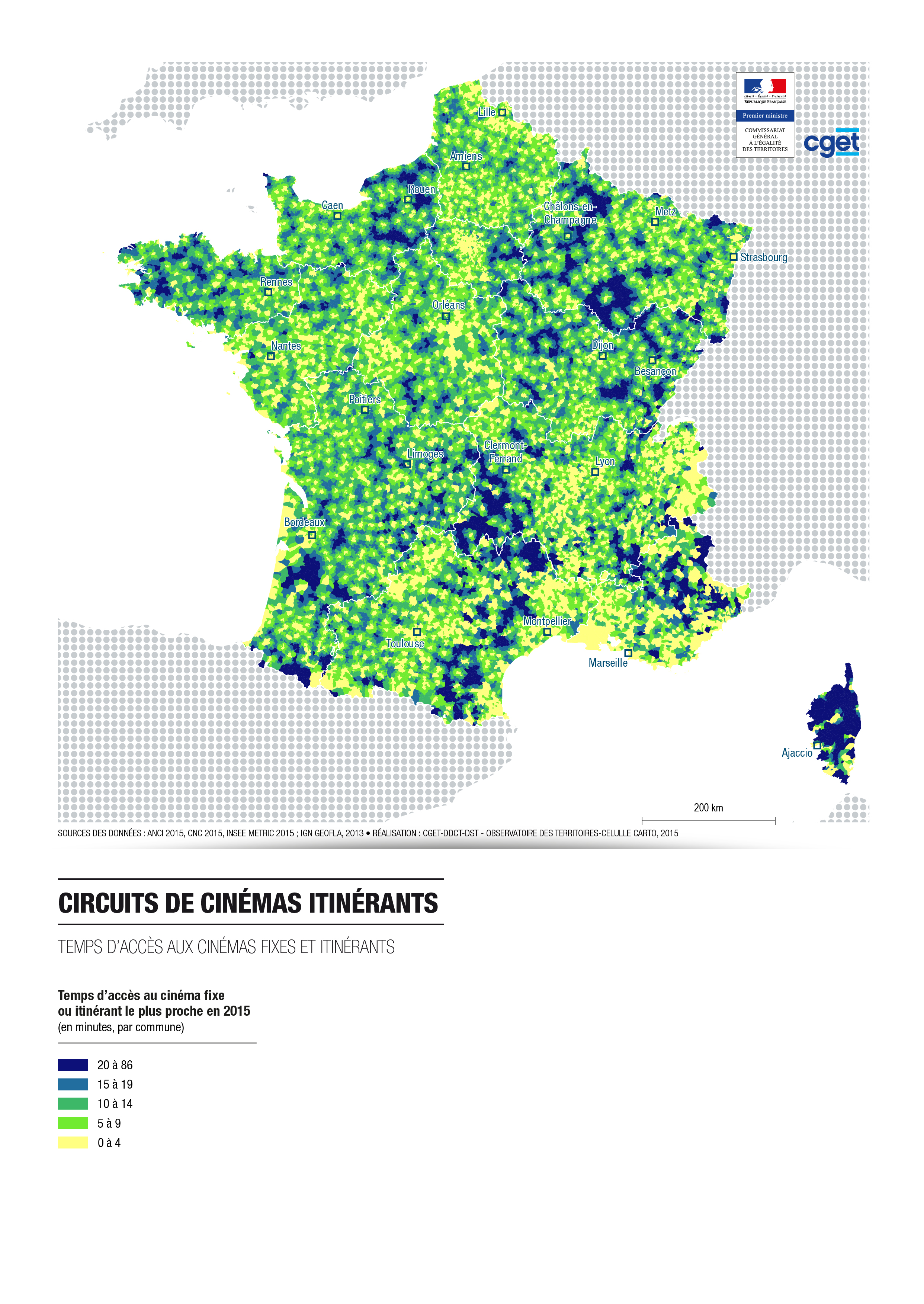 Cette carte décrit le temps d'accès aux cinémas fixes et itinérants le plus proche en 2015, par minutes par commune.