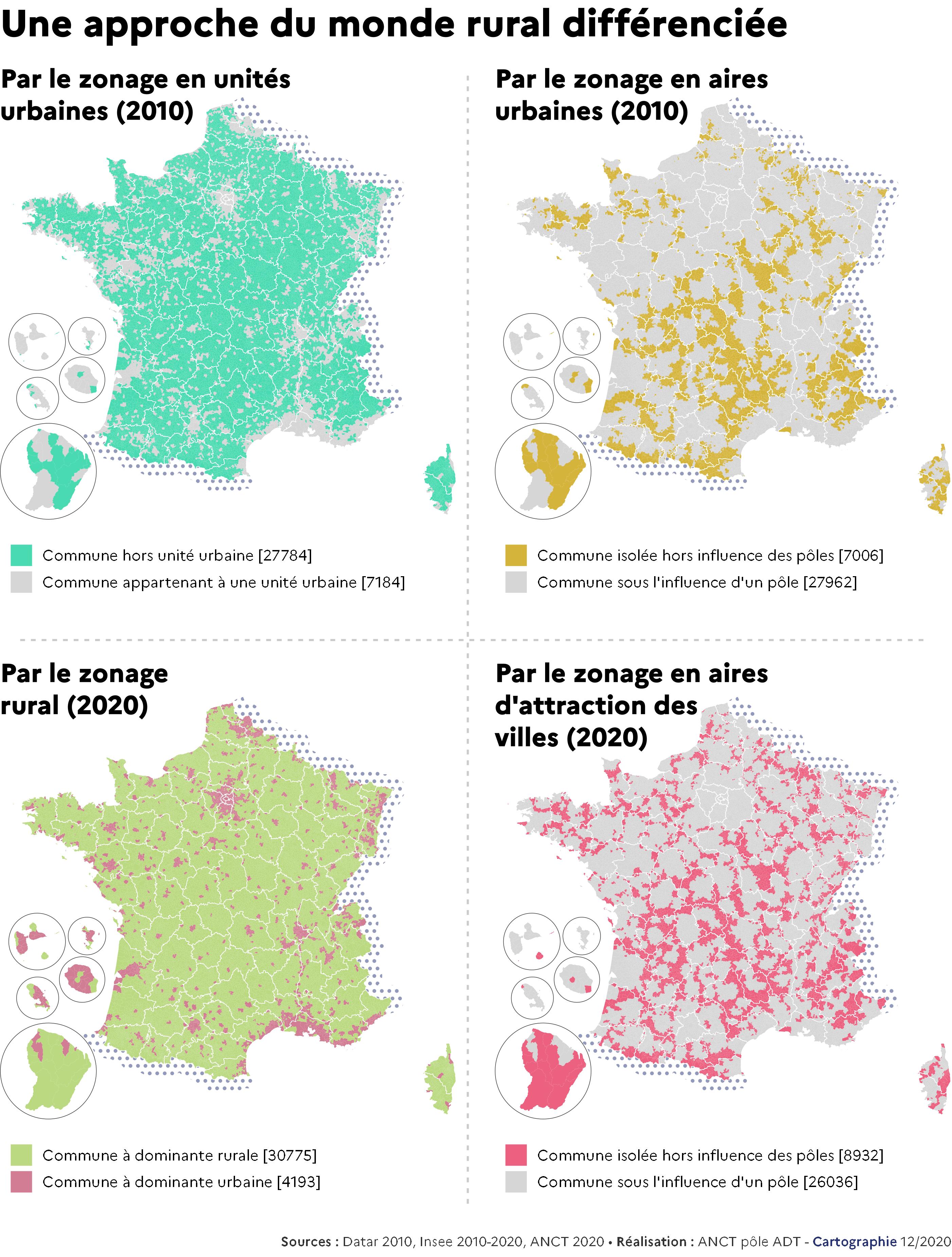 Les territoires ruraux vus au travers de différents zonages d'étude : 1) zonage en aires urbaines, 2) zonage en unités urbaines, 3) zonage rural, 4) zonage en aires d'attraction des villes