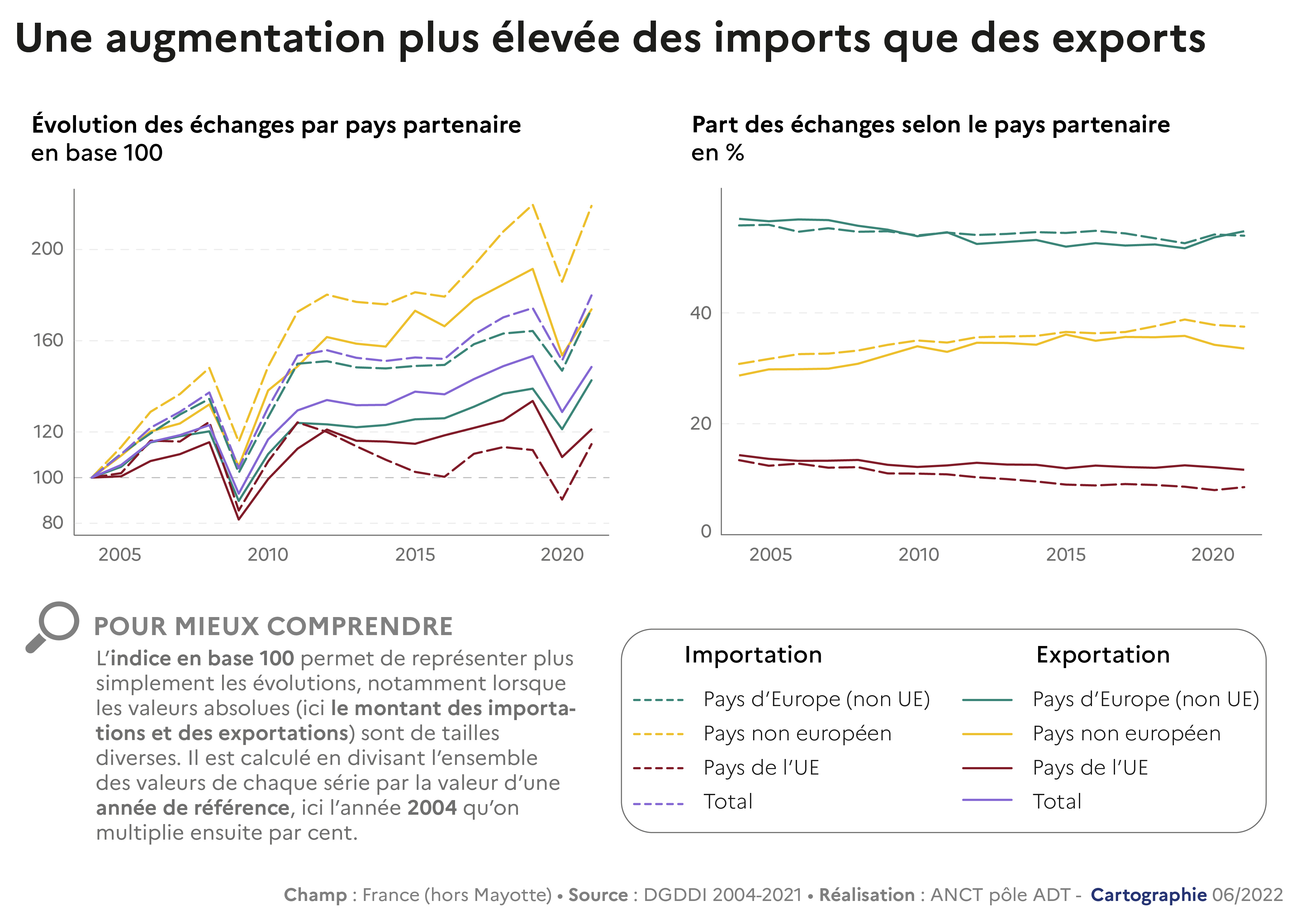 Part des échanges selon le pays partenaire en pourcentage et évolution des échanges par partenaire en base 100