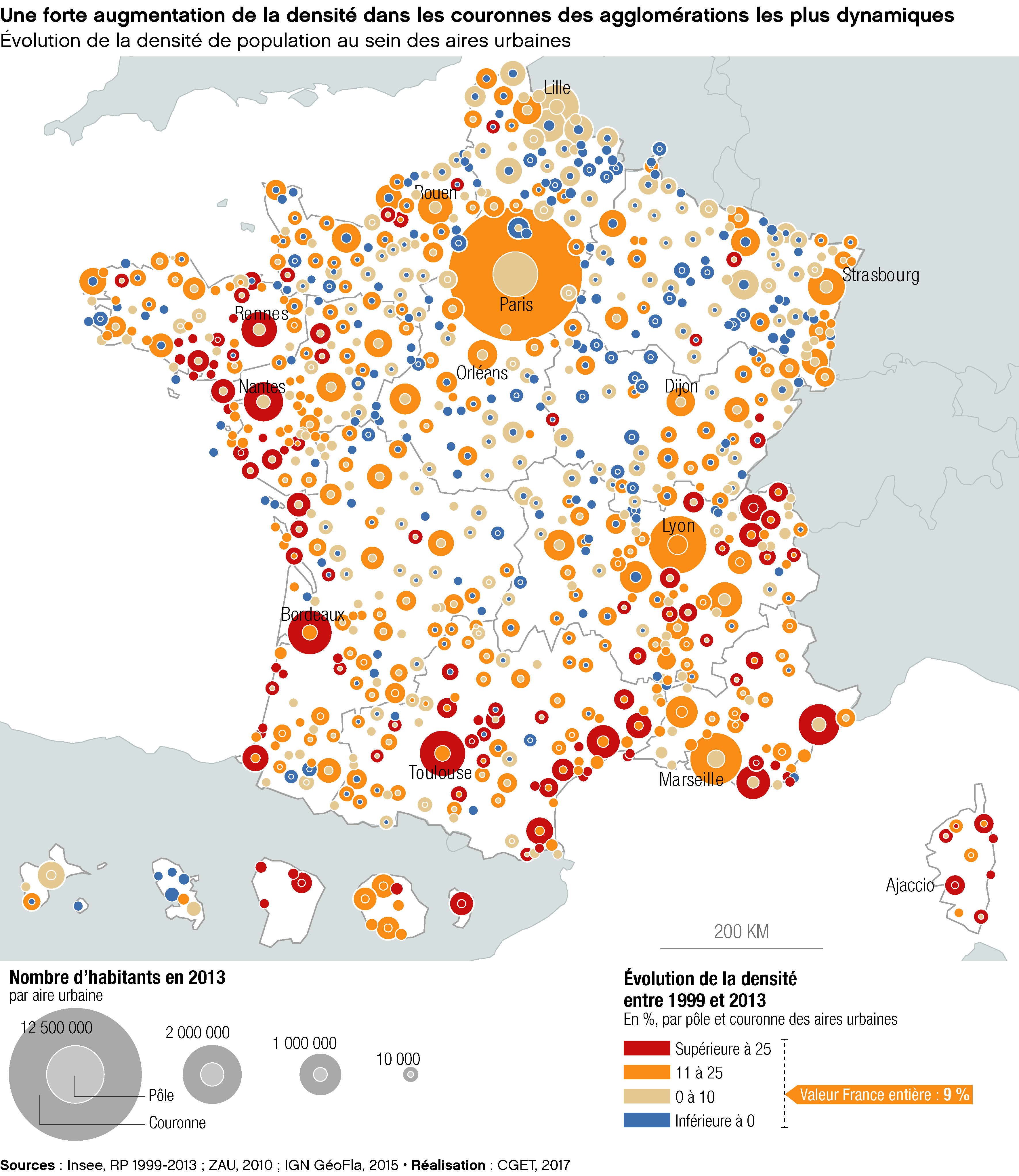 Évolution de la densité de population au sein des aires urbaines ; Nombre d'habitants en 2013 ; Évolution de la densité entre 1999 et 2013