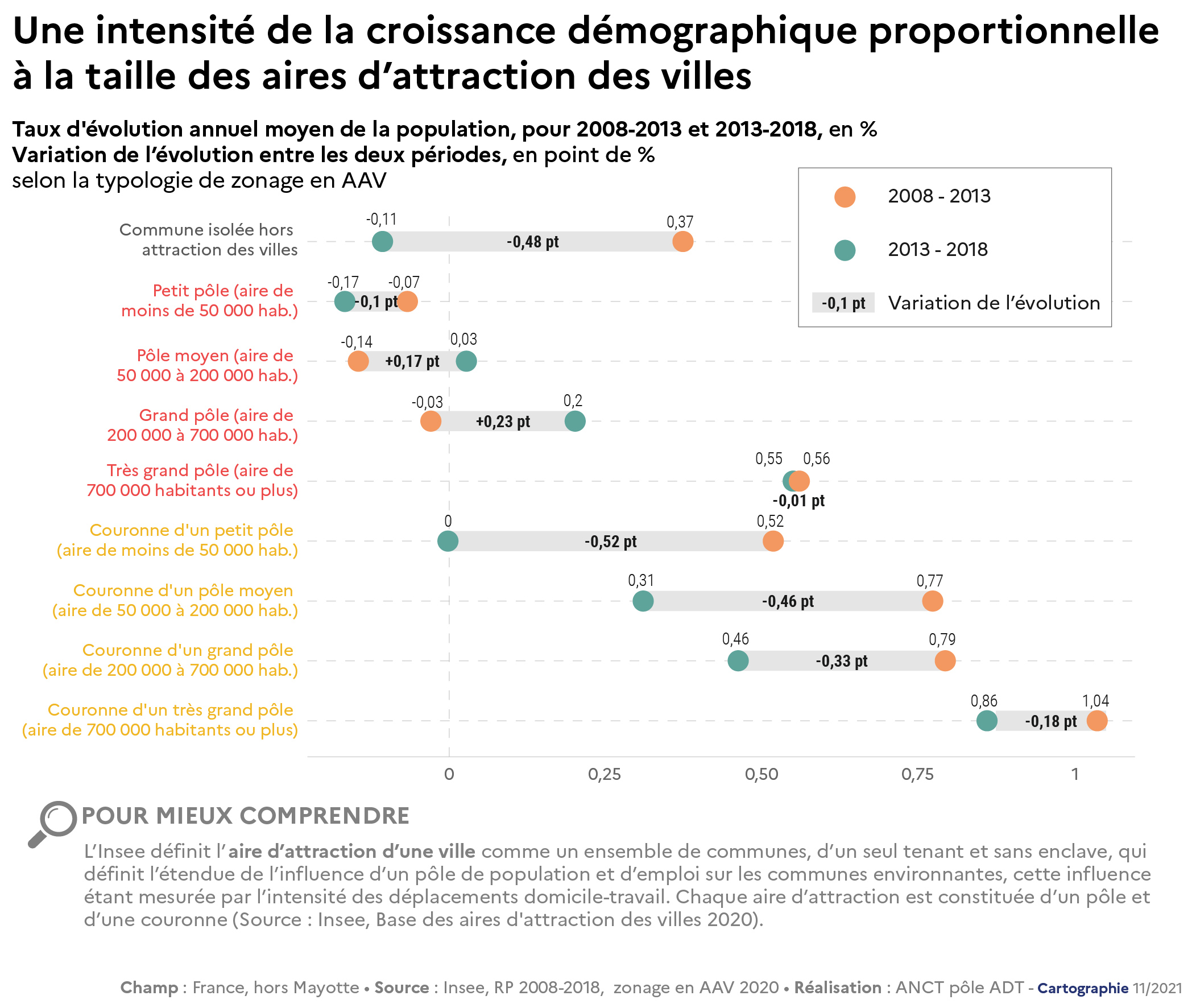 Taux d'évolution annuel moyen de la population, pour 2008-2013 et 2013-2018, en %.