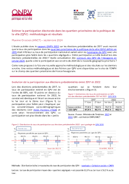 L'étude publiée dans le rapport ONPV 2022 sur les élections présidentielles de 2017 avait montré que le taux de participation dans les quartiers prioritaires de la politique de la ville (QPV) défini en 2015 était au taux de participation national et variait selon les typologies de QPV avec une participation plus faible dans les « quartiers ségrégués ». Cette participation a-t-elle évolué lors des élections présidentielles de 2022 ? Après l'actualisation des contours des QPV de l'Hexagone en janvier 2024 , quelle a été la participation aux examens de 2024 de la nouvelle géographie prioritaire ?