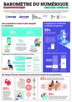 Le Baromètre du numérique est une enquête annuelle de référence qui mesure l’adoption des équipements et des usages numériques en France. Il analyse les tendances en matière de connexion, d’outils numériques, d’usages d’Internet et d’inclusion numérique.
