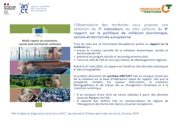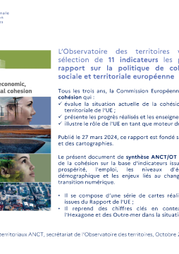 Tous les trois ans, la Commission Européenne publie un rapport qui évalue la situation de la cohésion économique, sociale et territoriale de l'UE. Publié le 27 mars 2024, ce rapport de l'observatoire des territoires partage de nombreuses données statistiques et cartographies. Il met en exergue l'évolution de la cohésion sur la base d'indicateurs variés (économie, emploi, démographie, environnement, numérique, ...).